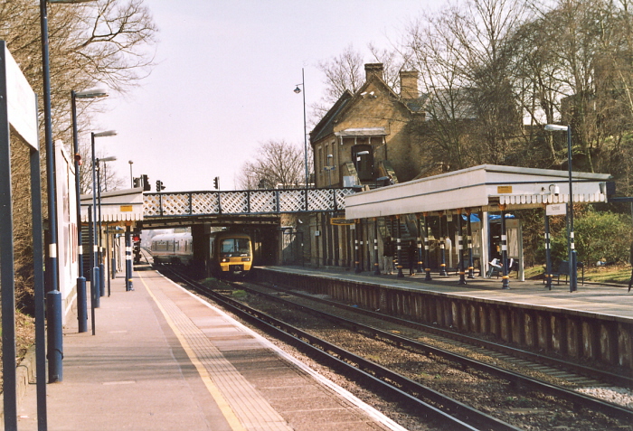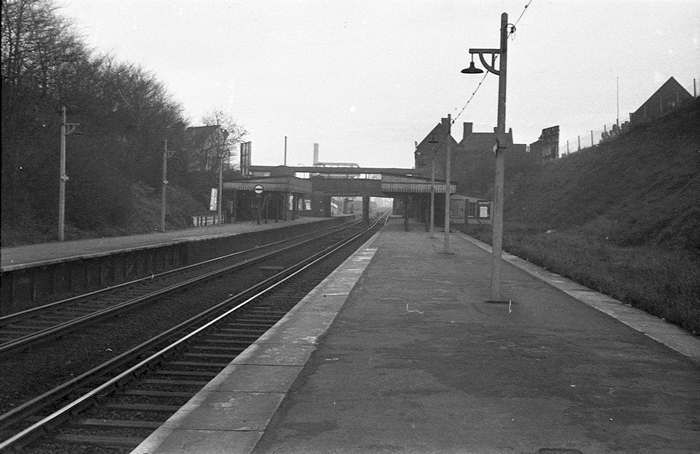 An eastward view from the ''up'' platform shows, on the right, the track bed of the former ''up'' bay line. On the ''down'' platform can be seen a banner repeater, required because the road bridge obscures the ''down'' starter signal. At this time, the footbridge still had a roof. © David Glasspool