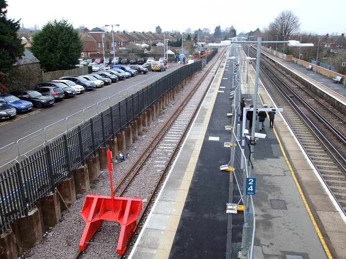 Part of the ''up'' side car park has been sacrificed to accommodate the new platform face and line, the works of which are seen in the above view nearing completion. © Roger Goodrum