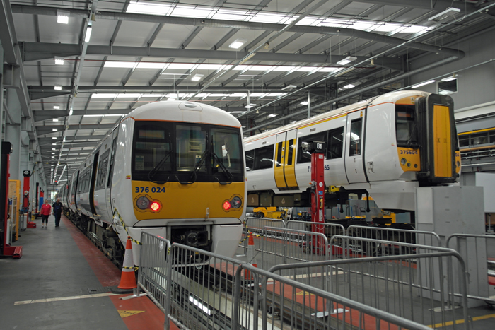 Far from its usual suburban environs, Class 376 No. 376024 was also available for cab inspection. The type is no stranger to Ramsgate and it was at one time the case that at least one Class 376 return trip was made from Slade Green Monday to Friday. We again see No. 375604, this time from the opposite end, jacked up. © David Glasspool