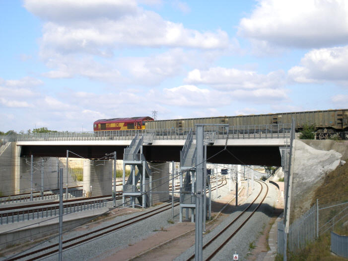 The Gare du Nord to St Pancras ''Record Run'' trip is seen passing under the North Kent Line at Ebbsfleet at 11:36, being on the verge of plunging into the Thames Tunnels. The formation used the Ebbsfleet station avoiding line, which is distinctly separate from the platform tracks. Despite the running of this excursion, Class 373 formations on driver training runs continued to use the tracks in the foreground during the same morning. © David Glasspool