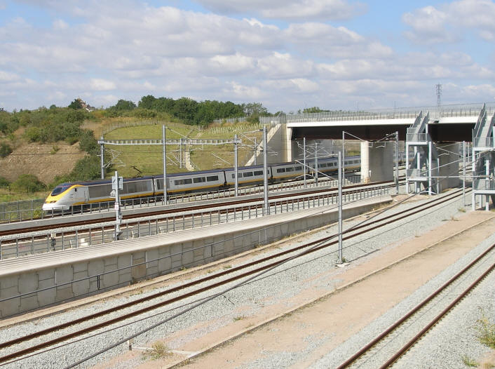 The 30th July 2003 was a significant date in the history of the Channel Tunnel Rail Link, for it marked the setting of a new British rail speed record along the route's ''Section 1'' (Fawkham Junction to the Chunnel portal). Class 373 ''Regional'' half sets Nos. 3313/3314 achieved a top speed of 208 MPH, and the occasion marked the beginning of a decided reduction in journey time. Twenty minutes was slashed from the duration of Waterloo to Paris and Brussels services. The French capital could now be reached in 2 hours 35 minutes, and one could be in Brussels within 2 hours 20 minutes. The accelerated international services commenced on 28th September 2003. The last piece of the jigsaw puzzle, ''Section 2'', laid between St Pancras and Southfleet (Junction), and the construction of this route had begun three years later than that of Section 1. In the interim, Eurostar services would continue to be routed via Bromley South on the ''Chatham'' main line, but rather than branching off for the Tonbridge route at Bickley Junction, international trains would be sent onwards through St Mary Cray and Swanley, to eventually meet Fawkham Junction, about three fifths of a mile west of Longfield. Here, a 3½-mile long line, electrified for most of its extent by overhead catenary, connected with Section 1, albeit by means of a somewhat roundabout route. However, Eurostar's record run on 4th September 2007 marked the beginning of the end for this interesting arrangement. The opening of the 24-mile long Section 2 of the CTRL will reduce journey times by a further twenty minutes, permitting a St Pancras to Gare du Nord service of 2 hours 15 minutes duration, and a two hour-long Brussels service. The record-run formation departed Gare du Nord at 10:43 Paris time (or, 09:43 British Standard Time), completing the journey in 2 hours, 3 minutes, 39 seconds. This was achieved by running at speeds above the maximum operating limit planned for standard service trains (186 MPH), the formation reaching 195 MPH on British soil. The existing Waterloo to Gare du Nord journey distance, via Herne Hill, Fawkham Junction, and Ashford International, is 307.8 miles; the transferring of services to St Pancras will result in a marginally reduced mileage of 305.7.