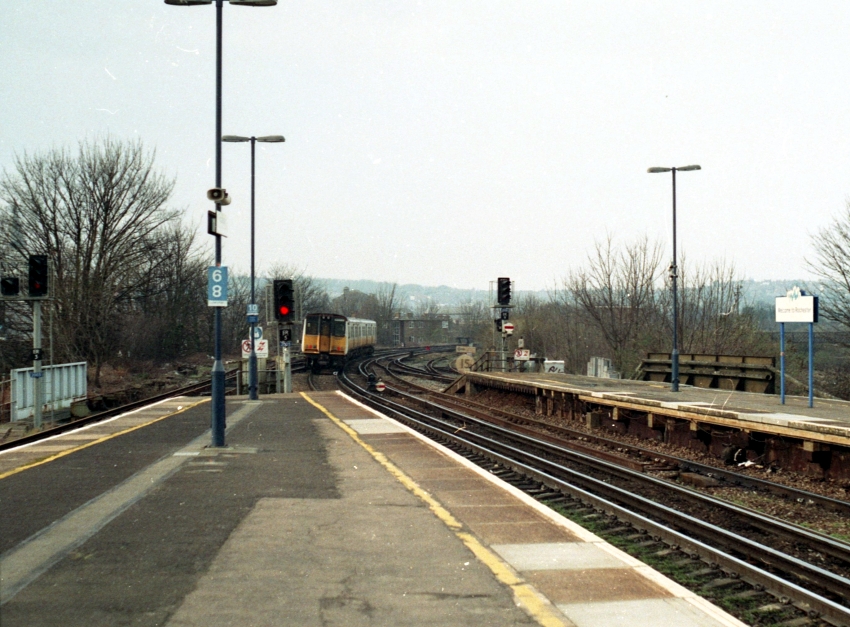A Class 508 trundles towards Strood in this westward view from 11th March 2004. This was during the period of the Strood Tunnel closure, when direct services from London to Gillingham via Dartford were suspended for a year. Strood Tunnel was lined inside with concrete to prevent successive chalk falls inside in the future, allowing the speed limit to be raised from 20 MPH to 75 MPH. Class 508s were used to form shuttle services between Gillingham and Strood, where at the latter passengers would transfer onto a bus for Higham. © David Glasspool