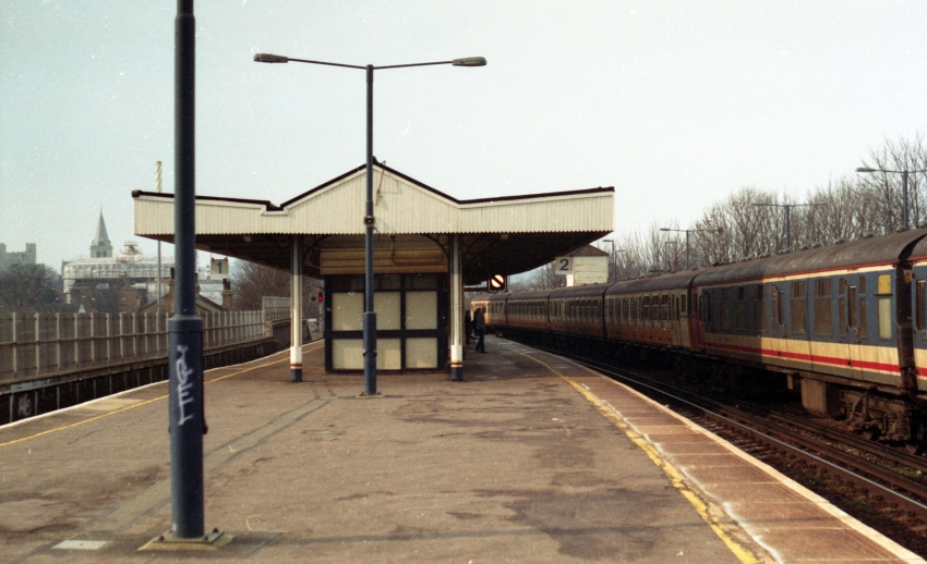On the turn of the 1970s, a number of historic station structures began falling foul to complete rebuilds using the austere CLASP prefabricated system. Both Strood and Rainham stations were casualties during this period, and although escaping largely unscathed, economies at Rochester were also enacted as part of this scheme. Circa 1973, the ‘’down’’ island platform canopy was dismantled and replaced by a trio of Spartan CLASP waiting shelters. The lift shaft retained its traditional casing and a short canopy was erected over the lift entrance. The "up" island canopy was also cut back by 40-foot at its southern end.