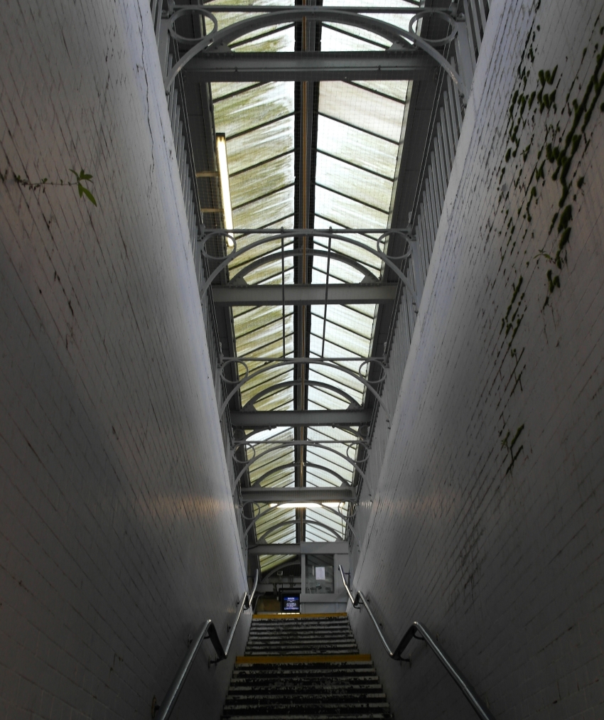 Looking down the stairs, we can see the fine metal railings and brackets which surround the subway entrance. The position of the lift can also be seen, its shaft continuing through the roof of the canopy. © David Glasspool