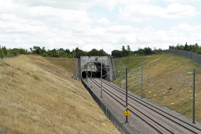 This is one of four tunnels situated on that part of the CTRL which formed construction Contract 420. The latter encompassed 20-KM (12¾-miles) of double-track line from Boxley, on Maidstone's outskirts, to Lenham Heath, which passed through an environmentally sensitive area. In an attempt to preserve the landscape and ensure the line's infrastructure had as little impact as possible on the localities through which it passed, a "cut-and-cover" tunnel approach was taken at Boxley, Hollingbourne, Harrietsham, and Sandway. The structure which emerged at Harrietsham is perhaps the black sheep amongst these, but at the other three locations, lengths of cutting were essentially "roofed" with earth and grass, providing both a noise barrier and favourable aesthetics.