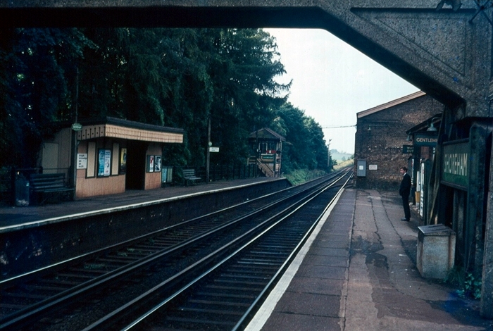 A splendid London-bound view shows the station in all its Southern Region glory, before rationalisation. Taking centre stage is the Saxby & Farmer signal box, with hipped slated roof and timber sides. We can also observe the connections between the running lines and goods yard, which had ceased to handle general traffic in 1962. SR Green Totems abound, but note that modern white signs, complete with black text, are creeping onto the scene on the ''up'' platform. Today, the quaint timber waiting shelter is no more, but we can at least observe a virtually identical example in use at Eynsford. © David Glasspool Collection