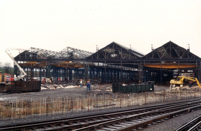 This view shows the demolition of the 1925 Heavy Repair Shop in full swing. The tracks in the foreground lead to the former engine shed building, which of course had for long been used to store empty stock EMUs. © Roger Goodrum