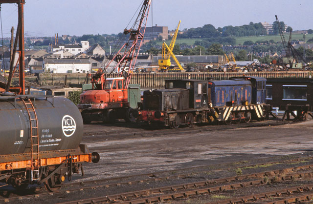 This 1984 view of Strood goods yard is full of interest. In the centre is Vulcan Foundry diesel shunter 0-4-0 ''Telemon'', which can now be found at Oswestry on the Cambrian Railway. Behind ''Telemon'' is an 0-6-0 shunter built by Hudswell Clarke in 1959, which had been acquired by W. M. Cory from the Port of Bristol Authority. It still wore the blue livery of its previous owner. In the foreground, on the left, is an ICI caustic soda wagon, a traffic which the photographer does not remember as being frequent at the yard. © Chris