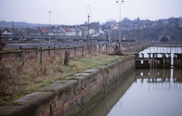 This second 1984 view is taken at ground level, and shows a Class 33 bound for the tunnel portal, hauling Sheerness Steel scrap wagons. In the foreground is the redundant dock basin, which was still complete with lock gates (albeit derelict). Sidings still existed immediately beyond the wooden posts on the left. © Chris