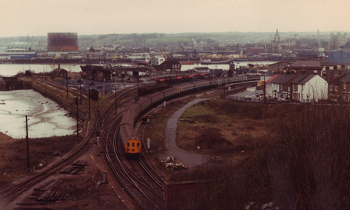 In early 1984, a ten-vehicle EPB formation is seen departing Strood, working a Gillingham to Charing Cross service. On the right can be seen the now vacated site of the engine shed, which was demolished in 1970. On the left is Strood Dock Basin. Behind the EPB formation can be seen the still operational goods yard. Within the latter can be seen a mix of vacuum braked HTV's and air braked HEA's, which would either have been conveying domestic coal for sale to local merchants or local industrial users. The absence of any coal stocks within the yard would suggest that the photo was taken after the commencement of the National Miners Strike in March 1984 for the duration of which most coal movements were stopped although certain dispensations were granted such as industrial coal for hospitals. © Chris