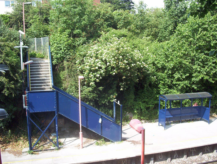 Both waiting shelters had gone by the time of this photograph, but the metal staircases of 1930 still existed. The door frame at the foot of the staircase formerly housed a trellis gate to close access to the platform. © David Glasspool