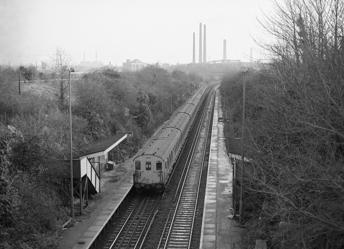 The original shelters are again in evidence in this eastward view, which shows 4 CAP No. 3303 forming the rear of an eight-car service. The three tallest chimneys in the background belonged to Northfleet Cement Works, whilst the other two (overlapping each other in this picture) were those of Northfleet Power station. The latter was oil-fired and had been taken out of operation in October 1987, thereafter remaining in a mothballed state in case needed for future electricity demand. © David Glasspool Collection