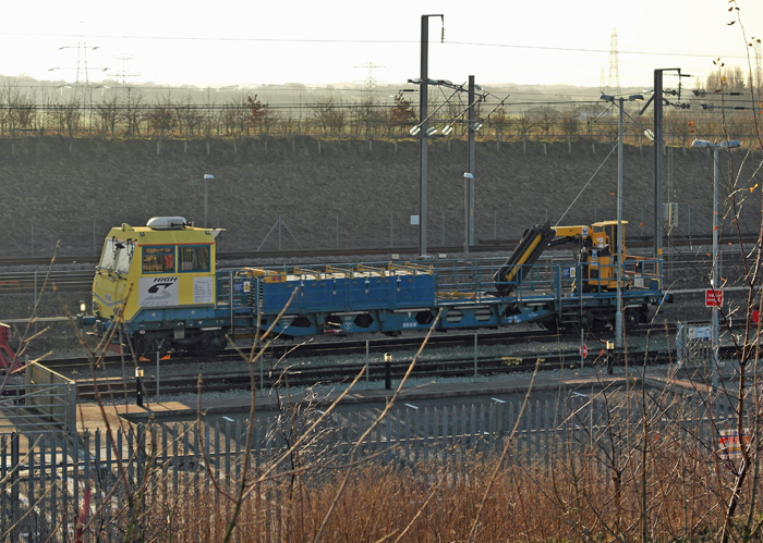 As far as the confines of High Speed 1 are concerned, this piece of traction is the sole member of its class. Known formally as a "Track Repair & Maintenance Machine" (TRAMM), self-propelled No. DX97001 comprises a single cab and crane arm situated at either extremity of a flat-bed chassis.