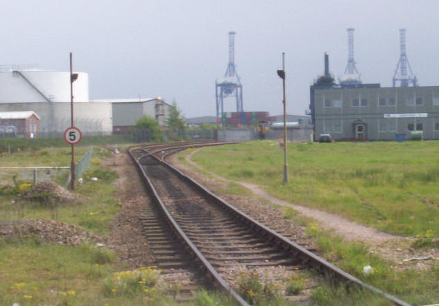 In the distance of this 9th May 2004 view are the container-lifting cranes of Thamesport and in the foreground is the line leading to them. Containers here are lifted onto flat-bed railway wagons and then diesel-hauled to either Crewe, Lawley Street (Birmingham), Leeds or Trafford Park (Manchester). Circuitous trips between Tilbury and Thamesport also used to run, but these were withdrawn in September 2005. © David Glasspool