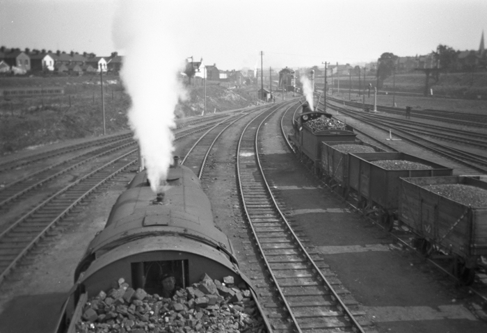 An eastward view towards the station, taken from the well known lattice footbridge, shows the plethora of tracks converging towards ''A'' signal box. In the immediate foreground is a Bulleid ''Coffee Pot'', whilst to the right is an ex-SE&CR ''C'' Class. In the middle-distance, on the right, can be seen the signal gantry which at that time controlled the station approaches on the Redhill line. © David Glasspool Collection