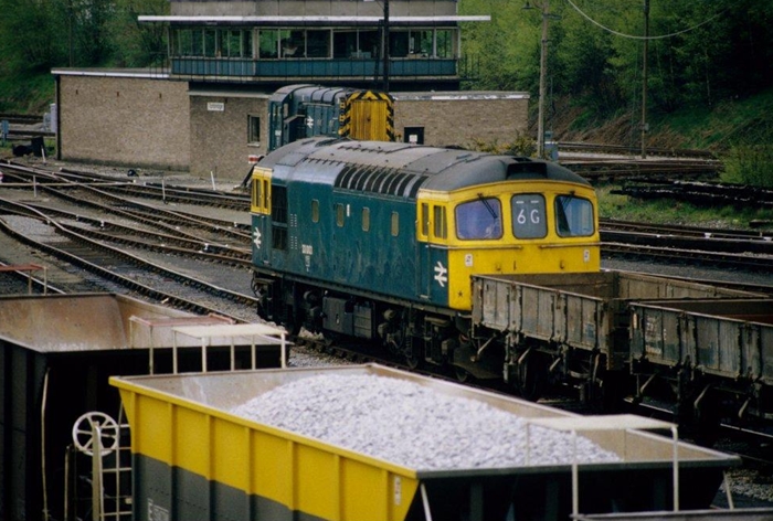 Tonbridge ''power box'', opened on 18th March 1962, forms the backdrop of this view showing Class 33 No. 33003. This locomotive was withdrawn after crash damage in August 1987. The points in the yard are changed manually; their white levers can be seen to the left of the diesel shunter. © Wayne Walsh