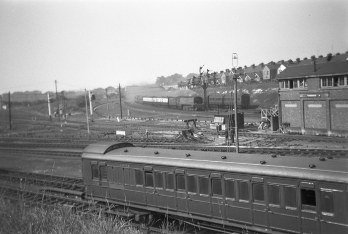 An Unrebuilt Bulleid Pacific rounds the curve at the west end of the station, fronting a named Victoria to Dover boat train via Orpington. The engine retains a high-sided tender, and a couple of Blood and Custard Bulleid-designed carriages can be seen trailing behind. The white signal posts just left of centre are on the throat of Tonbridge West Yard, and the sturdy SR-built ''A'' box is on the right. The sidings behind the Bulleid Pacific and in the immediate foreground can be seen holding ex-SE&CR ''Birdcage'' stock. © David Glasspool Collection