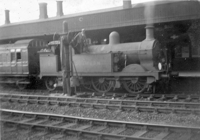 The fireman is seen refilling ''H'' Class 0-4-4 No. 31543 with water in the ''down'' platform loop. At this time, the engine still wore Southern Railway livery with ''Sunshine'' lettering. Behind the engine can be seen the distinctive end of an ex-SE&CR ''Birdcage'' carriage. © David Glasspool Collection