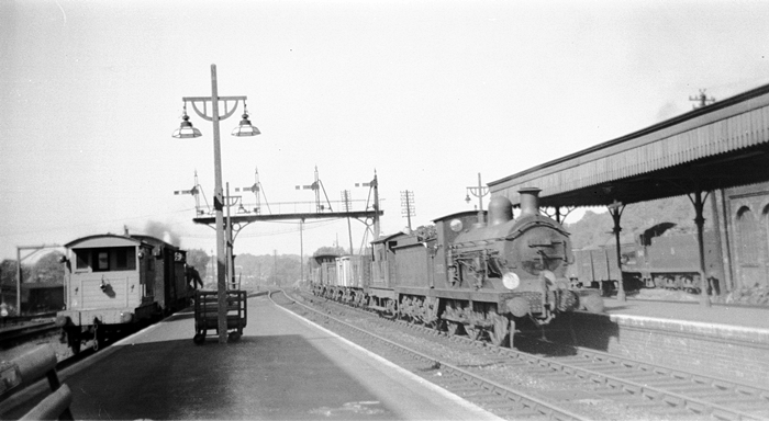 A westward view from the island platform in about 1958 shows an ex-SE&CR ''C'' Class 0-6-0 running into the station with a freight, the wagons being sandwiched in-between a pair of guard's vans. To the right, in the background, can be seen a Maunsell ''S15'' on the engine shed approach roads. On the left can be seen the rear of a short freight, headed by another ''C'' Class. Concrete bracket lampposts with hexagonal lampshades are in evidence, as are SR ''Target'' name signs. © David Glasspool Collection