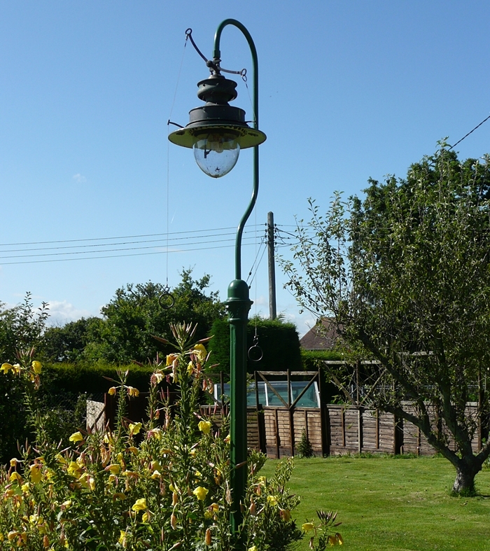 In the first photograph on this page, we saw an ''H'' Class tank engine passing a pair of Swan Neck gas lamps. Happily, one of these still exists, and can be found in a back garden. Its new owner, Vince Williams, reports: ''You will probably notice that the post is different from the original barley twist one and the lamp now runs on Propane. When I got hold of the lamp it was in a very poor state with most of the steel pipes etc rusted away, so I made all new ones in stainless steel. The original glass bowl didn't survive but after contacting the original manufacturer (Suggs), they had a new one. Apparently this type were called "Littleton" lamps and made specifically for the railways, only having 2 mantels. It makes a lovely feature in the garden.'' © Vince Williams