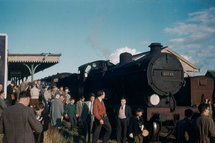 Ex-SE&CR D1 Class No. 31739 was observed at the terminus on the final day of operation, surrounded by a mass of photographers. The locomotive itself was withdrawn from service in the following month. On the left can be seen the spiked valance of the platform canopy, which had a very mild upward-slant. Behind the engine can be seen the pitched roof of the timber-built goods shed, complete with a ventilated van on the goods line. On the extreme left is the edge of a more recent addition - a large advertising billboard. © David Glasspool Collection