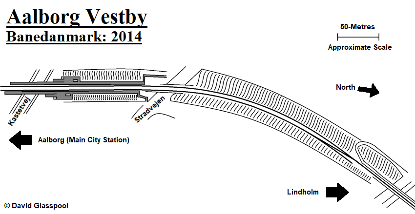 Aalborg Vestby is located 1-KM north of the city’s main 1902-opened station (this having replaced an earlier site dating from 1869) and 300-metres south of the bridge which takes the railway over the water of the Limfjord. Two 160-metre-long platforms were built upon the embankment carrying the double-track from the city centre; the formation narrows to a single line immediately before crossing the Limfjord. Each platform comprises a rectangular glazed shelter near its southern end, adjacent to which is a glazed lift shaft providing step-free access to street level. The lifts on both platforms were refurbished by "Banedanmark" — the government organisation which looks after the maintenance and operation of Denmark’s state-owned railway lines — between 24th September and 12th October 2018. Staircases are situated at both northern and southern ends of each platform, and the suffix “Vestby” literally translates from Danish to “west city”.