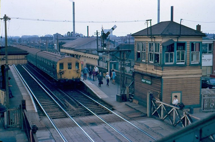 A scene which is unrecognisable compared with today, when traditional lattice crossing gates and semaphore signals still reigned supreme. A Bulleid-design 4-EPB is seen at the "down" platform with a service from Charing Cross, bound for Dartford - the "down" starter shows "clear" and the crossing gates are closed against the road, so our train is ready for the "off". The all-timber signal box was a typical SER creation, comprising this company's trademark sash-style windows and hipped slated roof. It appears that the signalman had a mirror affixed above the window nearest the level crossing, presumably used to check for pedestrians and traffic below. SER architecture also survived on both platforms at this time; the clover-patterned canopy valance of the "up" main building can be seen creeping in on the left, whilst the "down" side shelter is looking decidedly spruce. BR influence is evident on the platforms in the form of the concrete bracket lampposts and hexagonal lampshades, which were installed during 1956 platform lengthening. © Tom Burnham