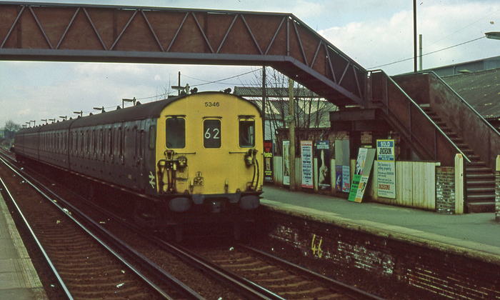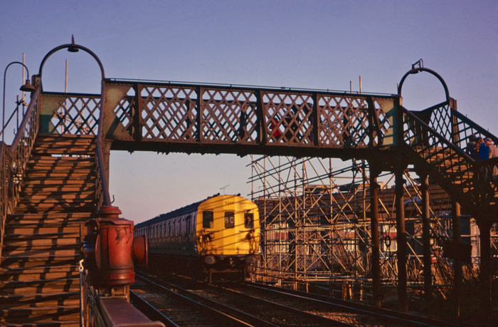The scaffolding being erected behind the footbridge, at the eastern end of the station, was in preparation for the building of the level crossing's replacement: the Harrow Manorway flyover. Completion of this resulted in the closure of the signal box and level crossing on 13th July 1975. 4-EPB No. 5240 was forming a Dartford to Charing Cross via Greenwich service. © Tom Burnham