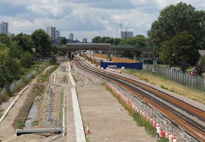 Newly-laid double-track for the Crossrail line is evident between the tunnel portal approaches at Plumstead, a distance of about half a mile. This can be seen terminating on the right within its own fenced-off compound. The ''kink'' of the North Kent Line, formed to accommodate the new tracks, is again evident. © David Glasspool