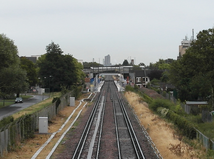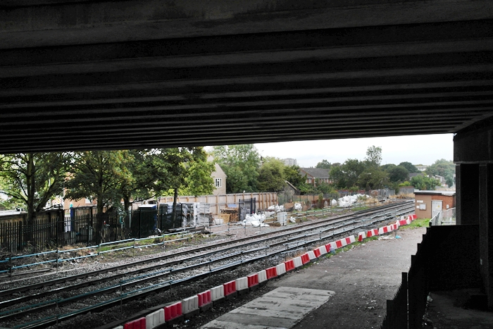This view at the eastern end of the station, under Harrow Manor Way, shows the site where the four lines will narrow to double-track. A short distance beyond the trees on the left can be found the main construction site offices, which occupy a former car park. © David Glasspool