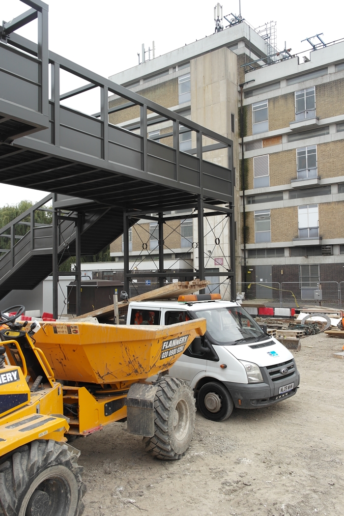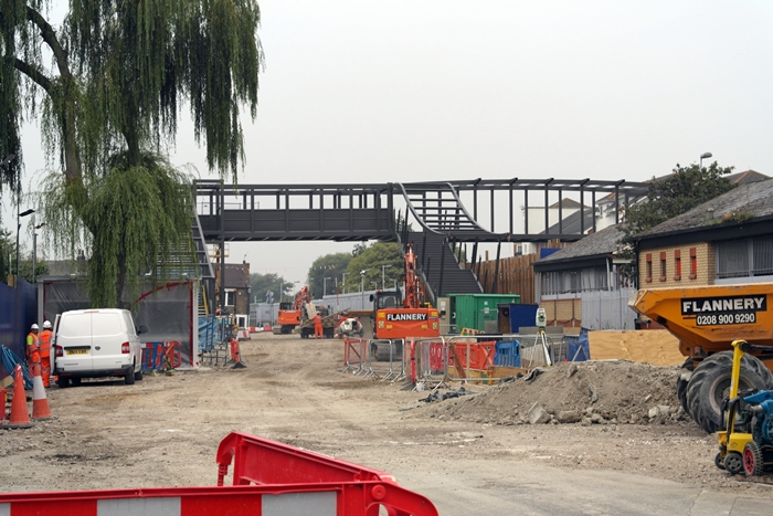 Since the photographs taken in August, the central staircase had gained framework for its roof. To the left, behind the white van, is the temporary booking office which, illustrations suggest, will be supported upon stilts to take it to the same level as the main footbridge span. © David Glasspool