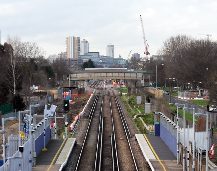 A westward view shows the new ''kinked'' alignment of the North Kent Line, works on the ''down'' side being well underway for the Crossrail track bed. In the foreground are the recent platform extensions, allowing the station to accommodate twelve-vehicle formations. © David Glasspool