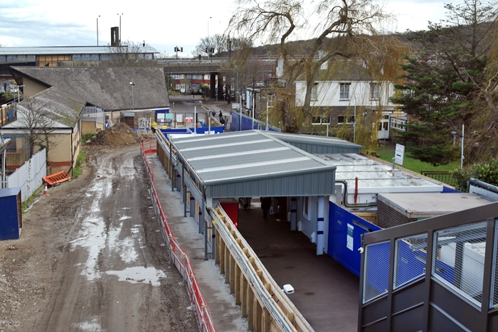 An eastward view from the new footbridge shows the previous structures still evident on the left, in addition to the full extent of the corrugated metal canopy which shelters the replacement offices. © David Glasspool