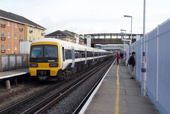 Engineering works over the weekend of 10th/11th January 2015 saw closure of Charing Cross, Waterloo East, Cannon Street, and London Bridge (Eastern) stations. Therefore, North Kent services were diverted to Blackfriars and Victoria, whilst some terminated at New Cross. Here, we see Class 465 No. 465008 forming the rear portion of an eight-coach train from Blackfriars to Dartford. This ran fast from Blackfriars to Lewisham, then stopped at all stations to Dartford via Woolwich thereafter. In the background can still be seen the previous footbridge, this of which was assembled in 1977 using parts salvaged from the Blackfriars station rebuild.© David Glasspool