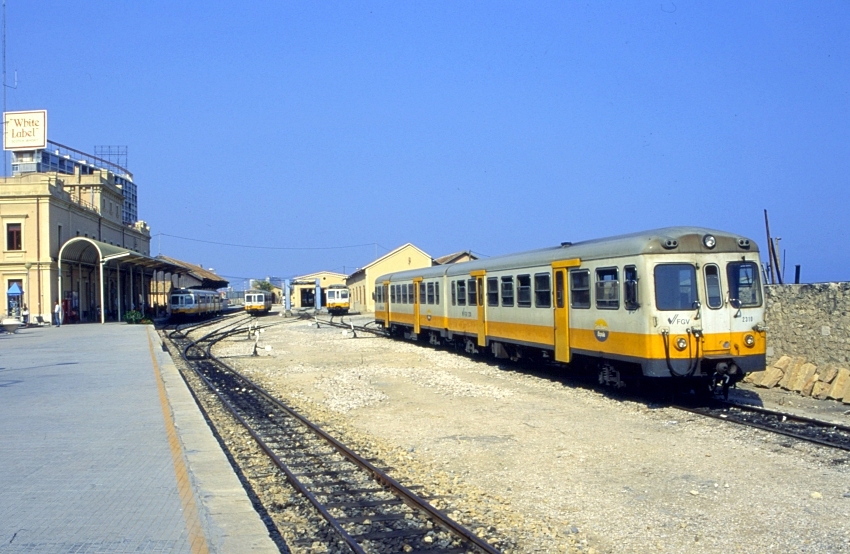 A roughly north eastward view in the Benidorm direction includes four 2300 Series two-vehicle diesel units, which at that time plied the route between Alicante and Denia. On the right is unit No. 2310, which went into departmental use on the route after electrification. The fine original main station building, seen on the left, dates from the opening of the line and is somewhat castle-like in appearance — a near-identical station, comprising the same architecture, was once in evidence at Denia. The 1980s-styled platform canopy was still standing in April 2003, but had gone a year later. Stabling, maintenance, and goods buildings, seen in the background here, were established at both extremities of the line. © David Glasspool Collection