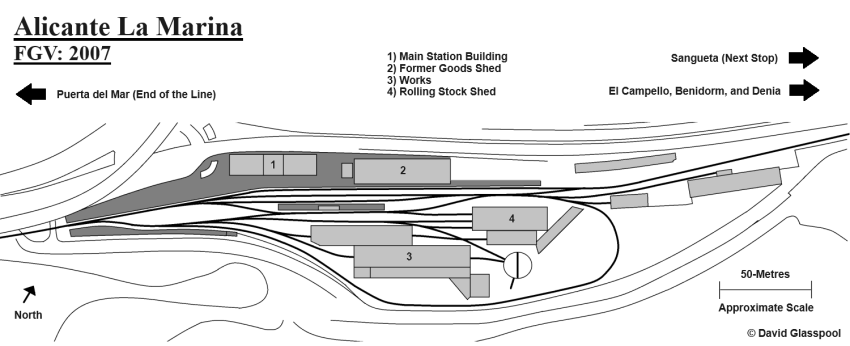This section of the website, however, does not cover the "main line" terminus station of Alicante, officially known as "Alicante Terminal". Rather, it concerns what was once a waterfront stop by the name of "La Marina", formerly the southern terminus of a metre-gauge 93-KM-long railway winding its way along the coastline between Alicante and Dénia. La Marina has since been severed from those rails that serve the Costa Blanca; however, a fine station building and former works structures still exist from the railway’s first days in the early 20th Century.