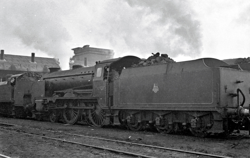 Part of the Southern Railway's shed of 1931 is evident in this view, which depicts "Schools" Class No. 30921 "Shrewsbury" and a Maunsell "Z" Class 0-8-0 Tank. Above the engine's cab can be seen the shed's huge water tank, which was based on the same design as that which can still be found today at Ramsgate. The black triangles (coloured that way as a result of engine smoke) along the roof's balustrade formerly indicated the shed track number. No. 30921 was broken up for scrap in early May 1964 by Cohen's of Cransley, Kettering, Northamptonshire. In its final years, the engine had been paired with a larger tender acquired from a withdrawn "Lord Nelson" Class locomotive. © David Glasspool Collection