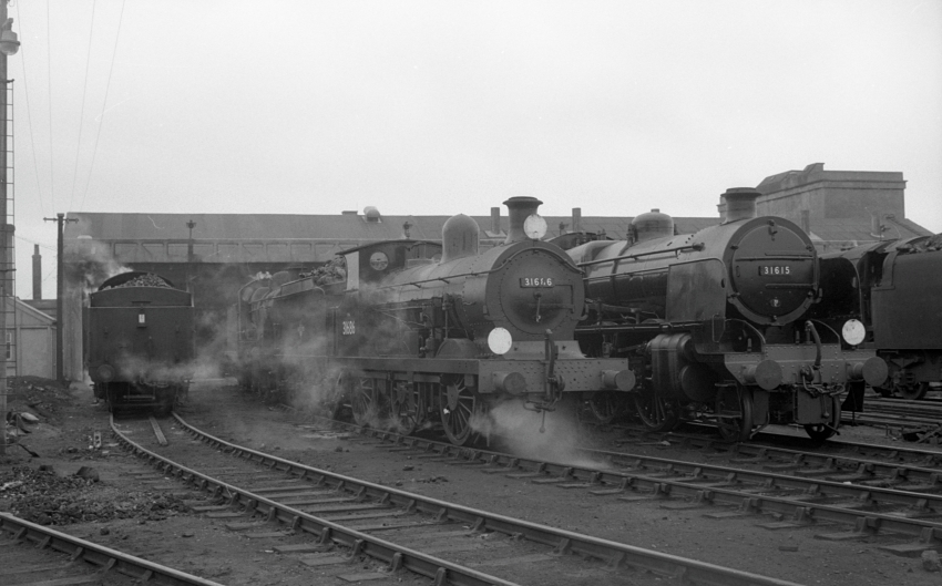 The allocation at Ashford in 1955 totalled fifty-three locomotives: a single 0-6-0 diesel shunter (later Class 08); four N15 "King Arthurs"; one "Z" Class 0-8-0 Tank; seven "H" Class 0-4-4 Tanks; three 0-6-0 "R1" Tanks; seven "C" Class 0-6-0 engines; three O1 Class 0-6-0 engines; seven "N" Class 2-6-0; one "D" Class 4-4-0; one "P" Class 0-6-0 Tank; four "L1" 4-4-0 engines; six "L" Class engines; four Ivatt 2-6-2 Tanks; and four Fairburn 2-6-4 Tanks. By 1959 that total had increased to fifty-five, but of that number, fourteen were diesels.