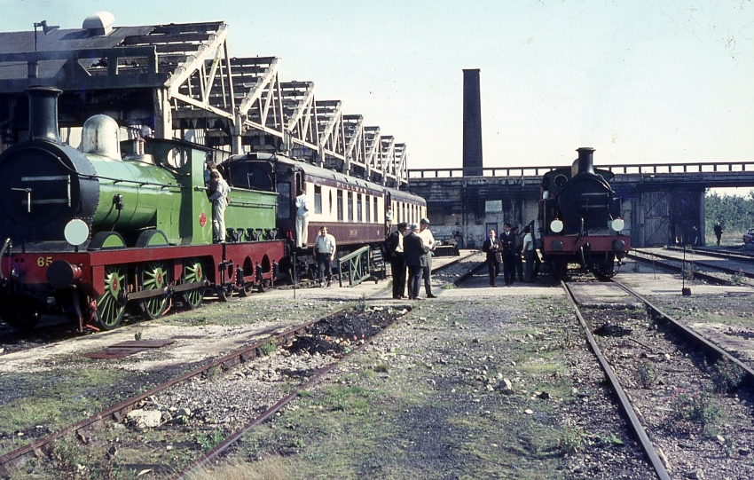 The skeleton of the former engine shed forms the backdrop of this south eastward view from 1970, by which time the site was in use by the "South Eastern Steam Centre". In the right distance can be seen the openings in the wall through which two tracks once passed out the rear of the building. "O1" Class No. 65 (BR No. 31065) and "H" Class No. 263 (BR No. 31263) are on the left and right respectively, both locomotives eventually ending up at the Bluebell Railway in Sussex. © David Glasspool Collection