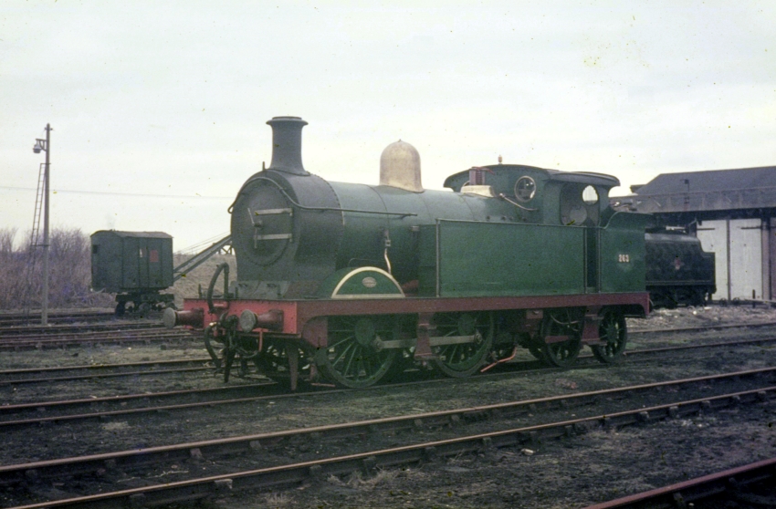 This photograph of "H" Class No. 263 shows, in the left background, the embankment which once led to the elevated coal stage. The tender in the right background was that of Black Five No. 45110. On 29th August 1971, Merchant Navy Class No. 35028 "Clan Line" arrived at the site. © David Glasspool Collection