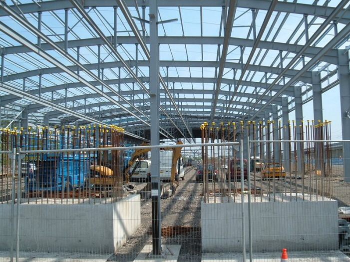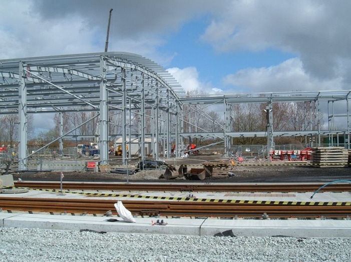 Under construction, the main arched roof maintenance shed framework is seen taking shape, whilst in the foreground are rail lengths for the newly re-aligned stabling sidings. © Paul Cooper-Hayden