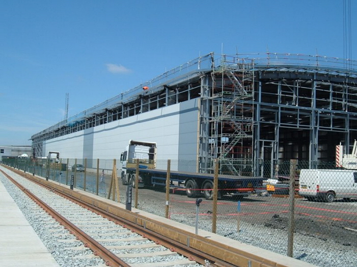 The depot is now seen at a more advanced stage of construction, as the framework cladding is added. The site of the stabling sidings had already been fenced off from the main complex by this time. © Paul Cooper-Hayden