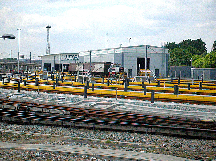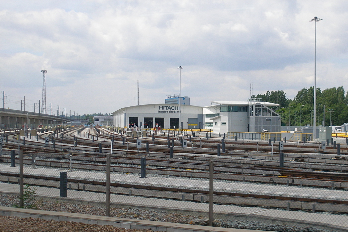 This westward view is full of interest: prominent in the centre is the five-road maintenance shed, which has four out of five doors open. On the left can be seen the multitude of EMU sidings which were re-laid nearer the CTRL viaduct, to accommodate the Hitachi site. In the background, emerging from behind the main depot structure, is Ashford IECC, whilst in the foreground, on the right, is the depot control room. Third rail on all sidings here is flanked on either side by wooden planks, for safety. © David Glasspool