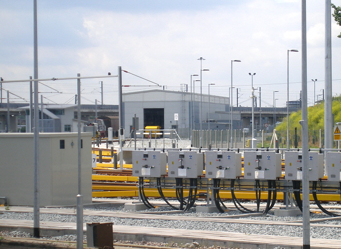 A final look over the Hitachi Depot yard provides a glimpse of the 25kV test track, and also shows the platform sections of the stabling sidings. Inside the Hitachi Depot, the red lights of two ''Javelin'' units can just be seen. © David Glasspool