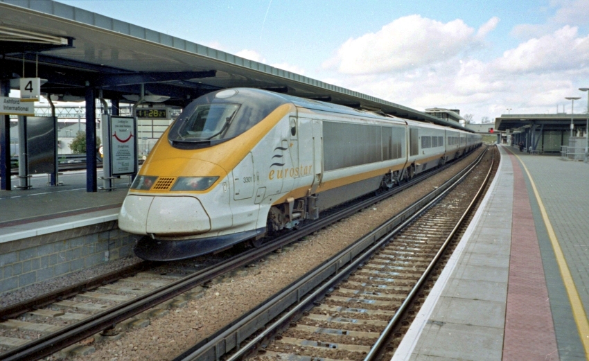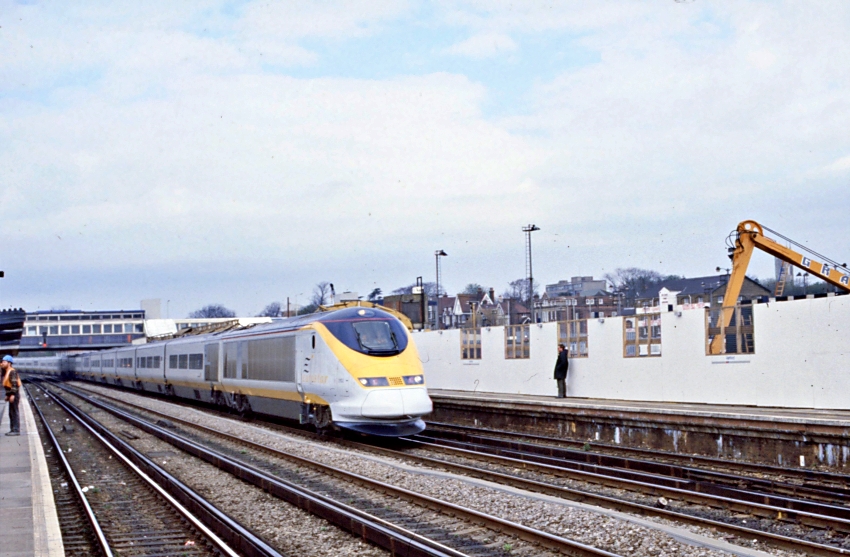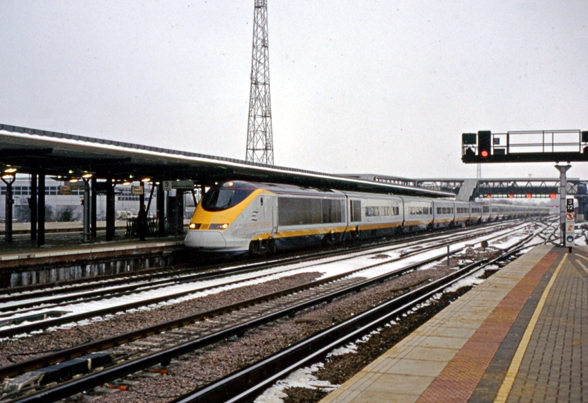 "Regional" Eurostar half set Nos. 3301 and 3302 are seen on a test run beside international platform No. 4. Fourteen of these half sets were manufactured to operate on "North of London" international services, calling at British provincial cities, going as far north as Glasgow and Edinburgh. These services never ran and, eventually, No. 3301 found itself deployed on the East Coast Main Line between Kings Cross and Leeds from summer 2000. © David Glasspool Collection