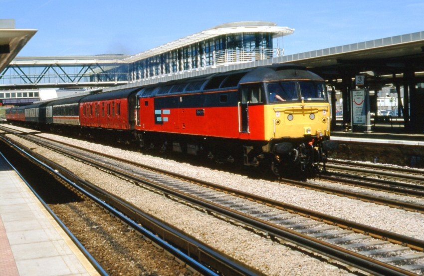 On the "down" through line between platform Nos. 2 and 3 is Class 47 No. 47475 "Restive", which was wearing the colours of British Rail sector "Rail Express Systems" (RES). RES handled parcels traffic and Queen Elizabeth II's Royal Train, and US-based "Wisconsin Central Railway" bought a one-third stake in the sector in December 1995. All parcels vehicles in the above photograph are of the BR Mk 1 profile, the liveries on display being Royal Mail Red, InterCity "Executive", British Rail Blue/Grey and, finally, RES Black and Red. The footbridge in the background dated from the station’s rebuilding as part of the Kent Coast Electrification Scheme, completed in 1966; this span was still standing in April 1998, but had gone by 2002. A short section of this footbridge still exists, linking platform Nos. 1 and 2 with the "up" side of the station, for staff use only. © David Glasspool Collection
