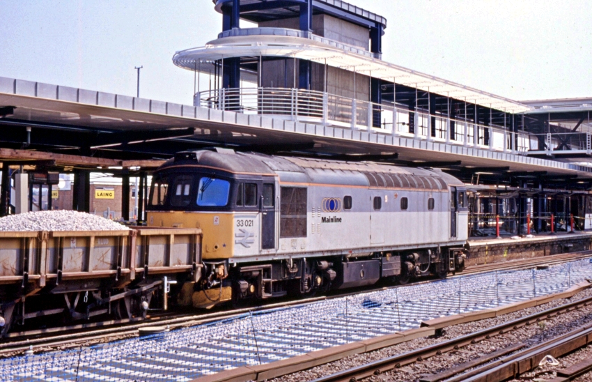 Class 33 No. 33021 was on hand with loaded ballast wagons as part of engineering works to relay the "down" through line. "Mainline", as displayed on the body side, was one of three freight brands — the other two being "LoadHaul" and "Transrail" — that the former BR TrainLoad freight sectors were divided up into as part of the privatisation process. No. 33021 had previously been part of the "TranLoad Construction" (stone) pool of locomotives based at Stewarts Lane and had received the "Mainline" logo by October. The framework of the buildings upon international platform Nos. 3 and 4 was well advanced, but glazing had yet to be installed. © David Glasspool Collection