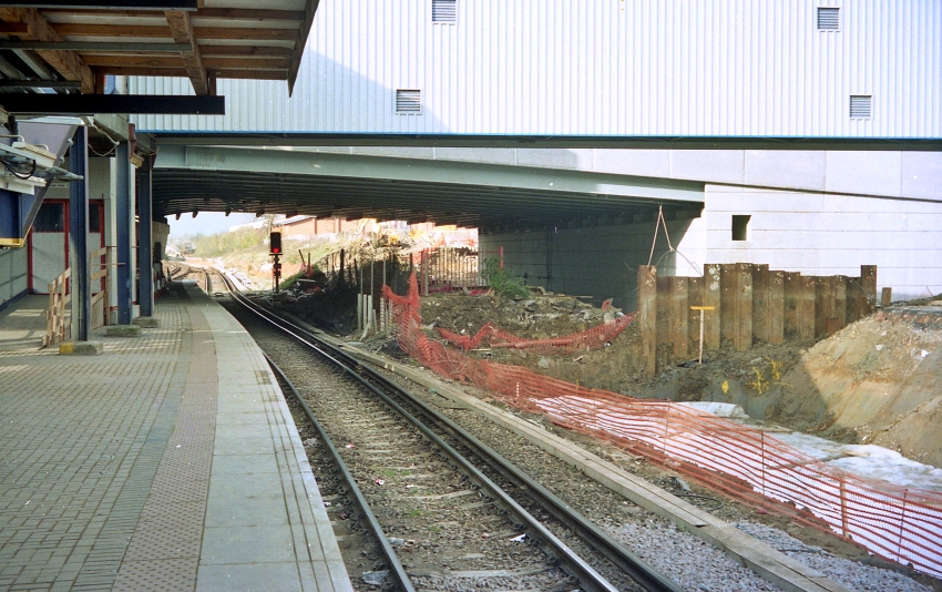 By 19th February 2002, there was track on the new CTRL formation in-between the Bearsted area and west of Ashford, and catenary masts — minus wires — were in place in-between the former and Charing Heath (ref: Branch Line News No. 917, Branch Line Society, 9th March 2002). In the last week of May 2002, track laying began over Ashford Viaduct and beyond, and by July of that year catenary masts (minus wires) had been installed along international platform Nos. 3 and 4 and also domestic platform Nos. 5 and 6 (ref: Branch Line News No. 926, Branch Line Society, 13th July 2002).