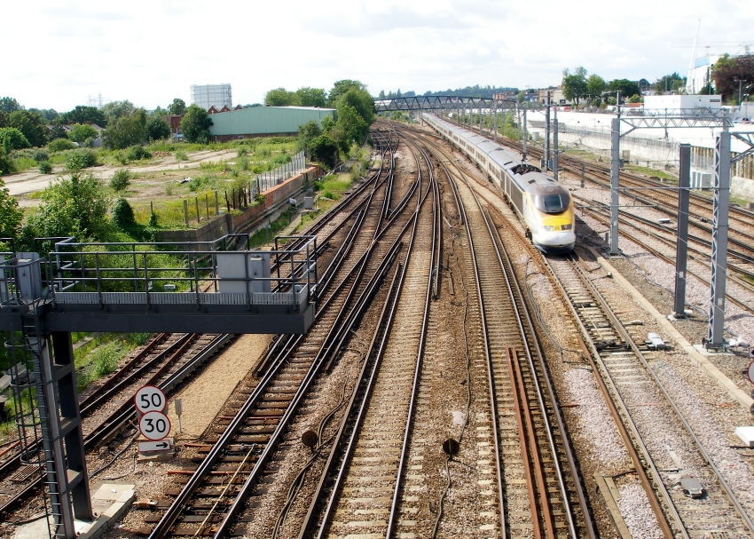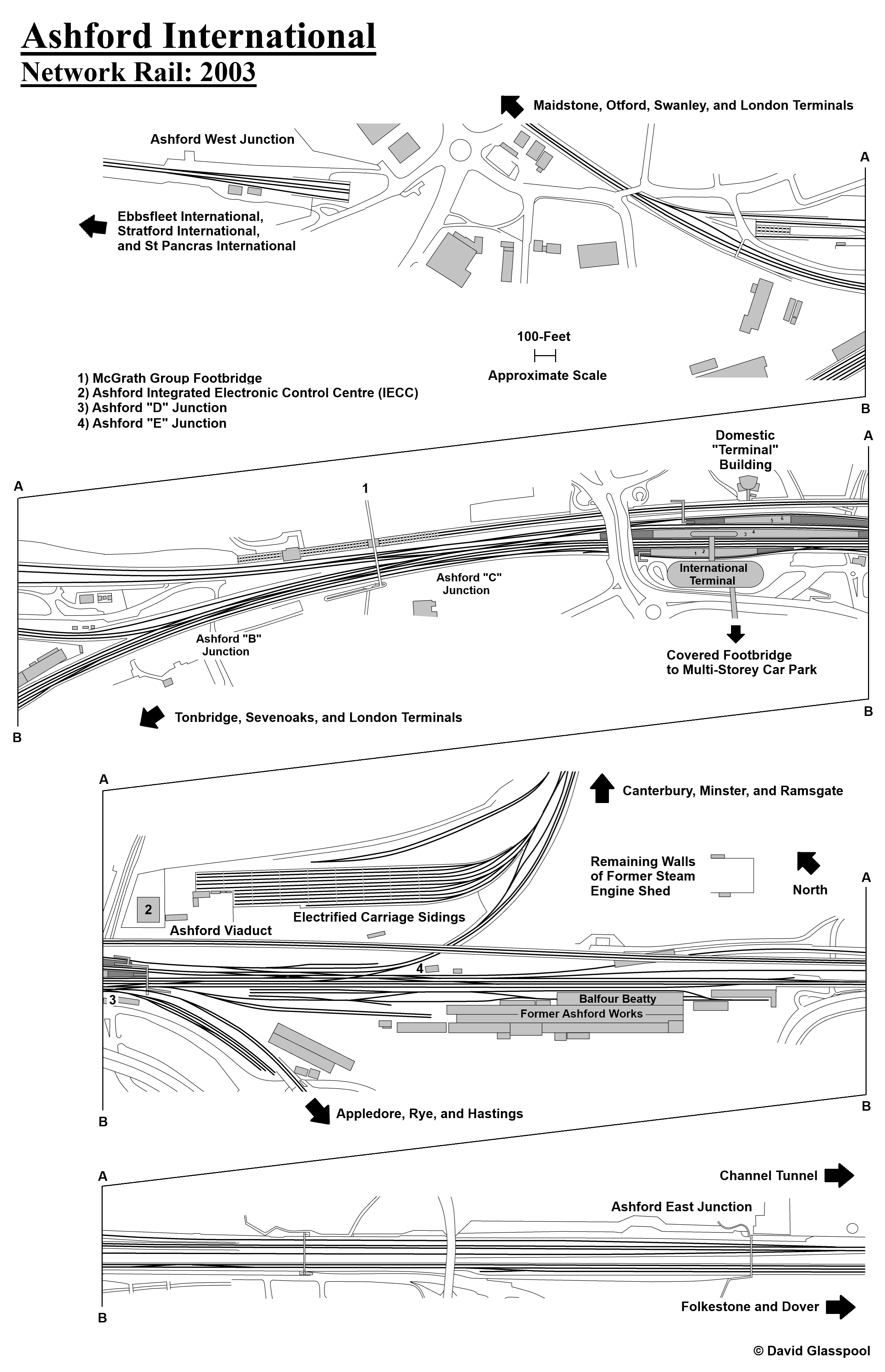 Ashford International in 2003, showing connections between the Kent Coast Main Line and the Channel Tunnel Rail Link (today's "High Speed 1"). Click the above for a larger version. © David Glasspool