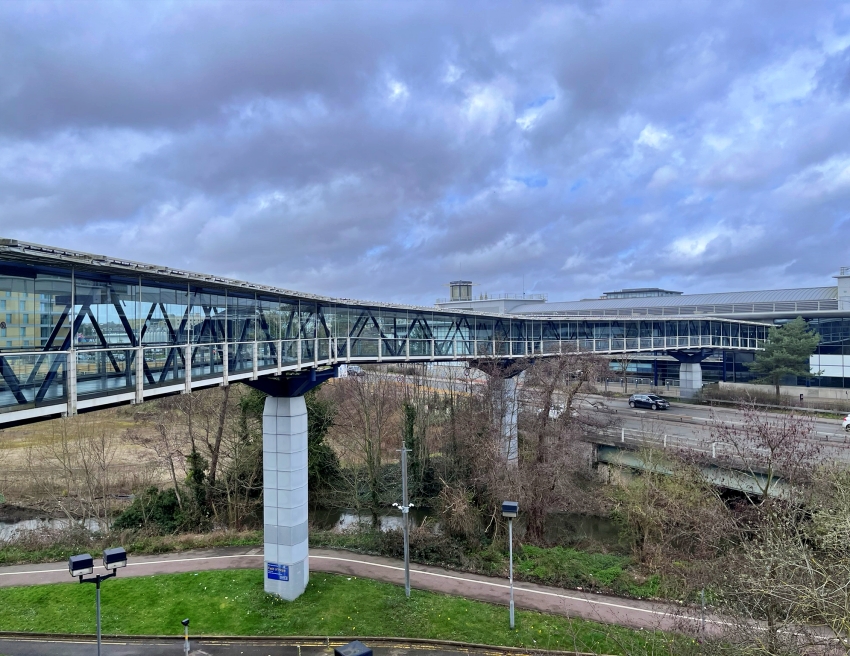 An 88-metre-long (290-feet) enclosed glazed footbridge links the south side of the station with a multi-storey car park, the latter of which was built in the same style as the railway buildings. This view was taken from the car park, looking northwards back to the station. © David Glasspool